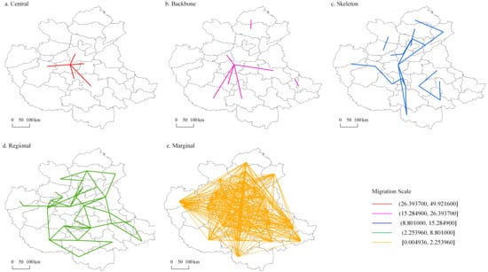 By using the natural breakpoint method in ArcGIS for the average migration matrix M′, the migration network connections of Zhongyuan Urban Agglomerations are divided into five levels: the central level, backbone level, skeleton level, regional level and marginal level, and each level of connections forms a small network, as shown in Figure 5.