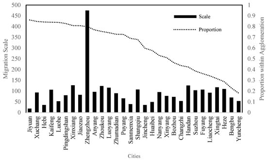 From the aspect of migration scale, the migration amount of Zhengzhou is much higher than that of other cities in the urban agglomeration, and it is the only city that exceeds 450 (474.45), while others do not reach 150. The cities in the second tier include Kaifeng, Xinxiang, Zhoukou, Luoyang, Shangqiu, Handan, Suzhou, Fuyang, Xingtai and Heze, whose migration scale exceeds 100, indicating that migration activities in the urban agglomeration are relatively active. From the perspective of internal migration proportion, several cities located close to the center of urban agglomeration generally have higher values. Among them, the proportion of 18 cities in Henan Province is greater than 0.5, which shows that migration within Zhongyuan Urban Agglomeration dominates in these cities. The migration scale of Suzhou, Fuyang, Xingtai and Heze is relatively large, but the proportion within the urban agglomeration is relatively low, indicating that these cities have weaker connections with other cities in Zhongyuan Urban Agglomeration.