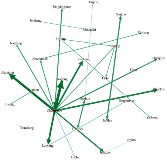 Figure 7 shows the maximum immigration scale of the 30 cities in a hierarchical way by taking immigration connections as an example. As seen from the figure, Zhengzhou is the largest immigration source for Kaifeng, Xinxiang, Jiaozuo, Luoyang and so on, showing an obvious “1-n” relationship with a high intensity. Among them, Zhengzhou and Kaifeng are each other’s largest immigration city and also form the city pair with the largest mutual migration scale in Zhongyuan Urban Agglomeration. In the periphery of the urban agglomeration, there are mainly “1-1” and “1-0” connection patterns, such as those of Xingtai-Handan, Changzhi-Jincheng and Huaibei-Suzhou. Most of these cities are not located in Henan Province in terms of administrative regionalization, and the migration activities are relatively independent.