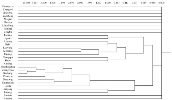 Based on the results of cohesive subgroups, the single-link hierarchical clustering method in UCINET is used to calculate the clustering results of Zhongyuan Urban Agglomeration at different levels, as shown in Figure 8.