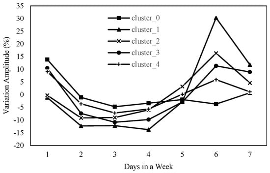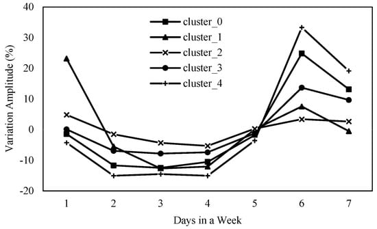 Cluster_0 includes Zhoukou and Handan, with a small overall variation amplitude of 18%, where the amount of emigrants is the largest on Monday, and that at other times of the week is small. Cluster_1 contains only one city, Zhengzhou, with the largest overall variation amplitude of 44%. The emigration intensity is the highest on Saturday, and the amount of emigrants is relatively small from Tuesday to Thursday. Cluster_2, with an overall variation amplitude of 25%, includes 5 cities, such as Sanmenxia, where the maximum amount of emigration occurs on Saturday and the minimum amount occurs on Tuesday. Cluster_3, including Suzhou and 11 other cities, has a moderate overall variation amplitude of 22%. The emigration intensity on Monday, Saturday and Sunday is high, and there is a decrease in the amount of emigration on Wednesday and Thursday. Cluster_4 includes 10 cities, such as Xinyang, and has the minimum overall variation amplitude of 16%. Among the cities in this cluster, the emigration amount is the largest on Monday and the smallest on Wednesday, with a significant increase on Saturday.