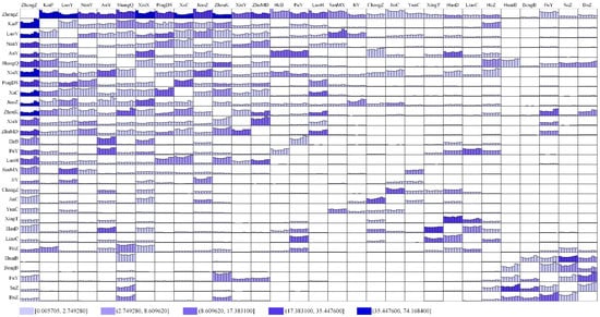 To display the migration scale in a more intuitive way, the natural breakpoint method is first used to classify the values and thus, graphs of different levels can be differentiated with color grading. On this basis, a bar graph containing a time axis is embedded in each cell of the matrix to give consideration to the expression of both the order of magnitude and amplitude of variation.