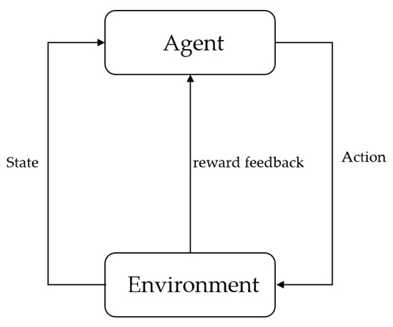Reinforcement learning is a method of machine learning, its essence is to find an optimal decision through continuous interaction with the environment [30]. The idea of reinforcement learning is as follows: The agent affects the environment by performing actions. The environment receives a new action, it will generate a new state and give reward feedback to the agent’s actions. Finally, the agent chooses the next action to perform according to the new state and reward feedback. The reinforcement learning model is shown in Figure 2.