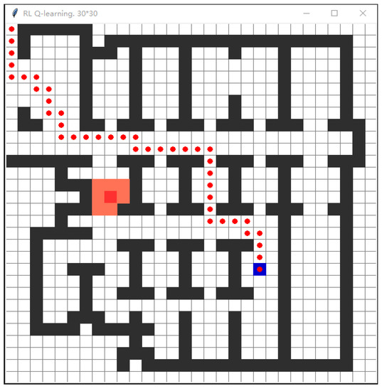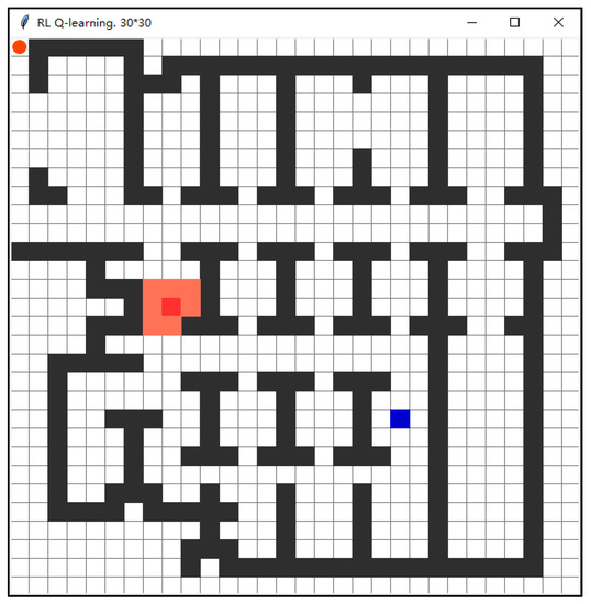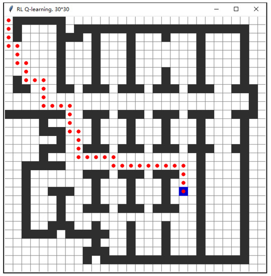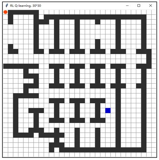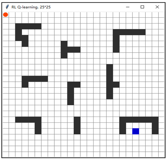 In this experiment, the Tkinter toolkit [40] was used to build an environmental model. In the algorithm simulation experiment, a grid environment with 20 pixels and a total number of 25 × 25 grids is constructed as an obstacle map. The agent selects and executes actions under this environmental model. The total number of grids in the environment is the number of states of the agent’s activity. As shown in Figure 4, there are a total of 625 states. The agent is represented by a red circle. The agent moves a grid on the map each time it performs an action. The initial point for this experiment is , and the target point is the blue grid at the lower right corner . The white grid represents the passable area, and the black grid represents the obstacle area. In Tkinter, the position of the rectangle is represented by the coordinates of two diagonal points, and the circle representing the agent is the inscribed circle of the rectangle. This has considerable convenience for representing the location. In the program, the map environment and the location of the agent can be designed by adjusting the grid coordinates. By observing the operation interface in Figure 4, the real-time position of the agent is known at each moment so that we can observe when the agent can plan the shortest path, which provides a reference for setting and adjusting the parameters.