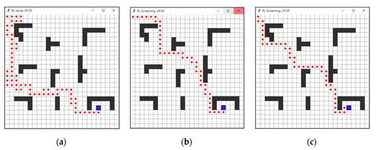 Simulation results of path planning under a 25 × 25 environment. (a) Path planning of the SARSA algorithm; (b) Path planning of the Q-learning algorithm; (c) Path planning of the proposed Q-learning optimization algorithm.