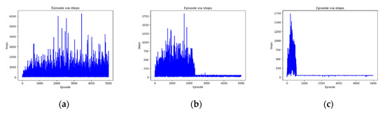 Graph of step changes during training. (a) Steps of SARSA algorithm; (b) Steps of Q-learning algorithm; (c) Steps of the proposed Q-learning optimization algorithm.