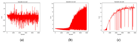 Change graph of cumulative rewards during training. (a) Cumulative reward of the SARSA algorithm; (b) Cumulative reward of the Q-learning algorithm; (c) Cumulative reward of the proposed Q-learning optimization algorithm.