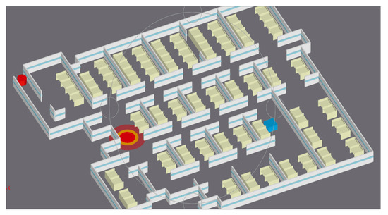The simulation environment is the internal scene of an office building in Beijing. To visually display the movement position of rescuers during the evacuation process, Glodon software is used to construct a 3D virtual environment map of the scene. The office building environment in the event of a fire can be modeled as shown in Figure 8. The blue rectangle represents people that need to be rescued, and the red and yellow concentric circles show where the fire occurs. This floor of the office building has only one exit in the top left corner. Rescuers are in the position shown by the cylinder in the upper left corner and move towards the target point for rescue. If rescuers want to evacuate the scene as soon as possible, they must consider the impact of distance and also the impact of different path sections and exit information on evacuation time. Therefore, the research content of this section can be verified through the 3D scene model, as shown in Figure 8.