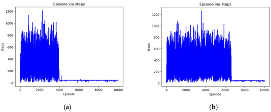 Graph of step changes during training. (a) No change in steps in the fire environment; (b) Change in steps in the fire environment.