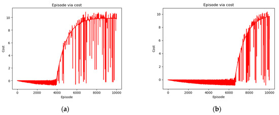 The Q-learning algorithm continuously accumulates rewards during the learning process and maximizes the cumulative reward value as the learning goal. At the beginning of learning, the agent is randomly selected and easily hits obstacles. When hitting an obstacle, the reward value is −1, so the initial reward value is negative or approximately 0. As the number of training sessions increases, the number of times the agent hits obstacles continue to decrease, and the accumulated rewards gradually increase. From Figure 7a, as the number of training iterations increases, the cumulative reward of the SARSA algorithm increases by approximately 0, and there is not an obvious trend of change during the training process. From Figure 7b, the cumulative reward of the Q-learning algorithm increases gradually with increasing training times and finally approaches 10. From Figure 7c, the cumulative reward change of the proposed Q-learning optimization algorithm is more stable than that of the previous algorithm, and approaches 10 at approximately 3000 steps.