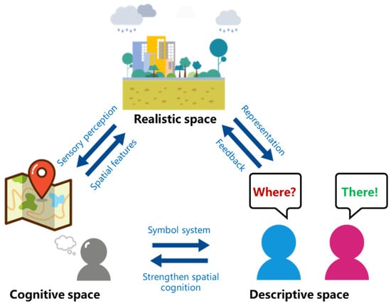 Spatial cognition is the ability of the human to recognize the existence, change mode and relative localities of various things and phenomena in the surrounding environment. Spatial cognition is also a process of processing all kinds of spatial information, including the relative location, spatial distribution and dependence of environmental things and phenomena, as well as their evolution with time []. Spatial cognition goes through the following three stages: “realistic space”, “cognitive space” (including a series of processes such as perception, representation, memory, thinking, etc.) and “descriptive space” (Figure 1).