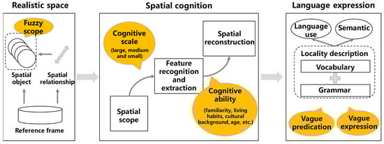 Spatial cognition is usually not fully perceived from one observation point, and its perceived range is scale-dependent. The scale needs to adapt to the types of objects and needs of cognition, to choose and define a reasonable spatial scale for spatial cognition. For instance, when one needs to know the location of the “Lotus Pond Park in Yangzhou City”, it is not accurate to only recognize the scale of the “central part of Yangzhou City”, people would prefer to know that the park is located “opposite the east gate of Yangzhou University in Guangling District”. Moreover, the scale of the reference object and target object need to match in the process of spatial cognition. For instance, in “Zhenjiang City is south of the Yangzhou University”, there is a scale mismatch. Inapplicable and mismatched spatial scales will produce vagueness in the process of spatial cognition. In the location description, the appropriate scale is usually determined by the characteristics of the target object.