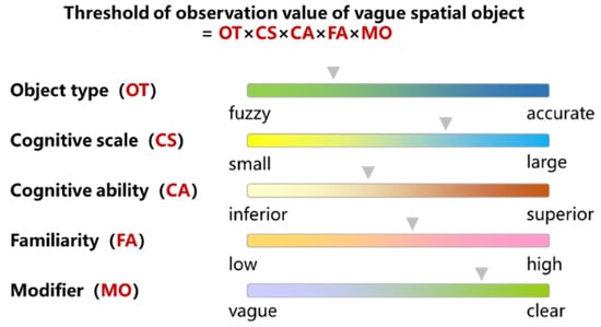 Setting thresholds for vague spatial objects requires consideration from the five dimensions in Figure 3. The specific threshold value can be determined in combination with practical application scenarios and individual cognitive habits. The threshold setting under different scenarios can refer to the expert experience and cognitive experiments. On the one hand, the reference range of cognitive ability is obtained by relevant scholars in spatial cognition research. On the other hand, the range of spatial objects is judged according to the results of cognitive experiments. The threshold setting of different individuals can grasp the real spatial cognitive state according to the question-and-answer method. In the question-and-answer method, questions can be set for the dimensions of vagueness, and the vagueness can be explained according to the quantifiable answer to set the threshold range.