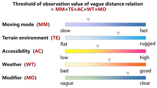 Setting thresholds for vague distance relation requires consideration from the five dimensions in Figure 4. The specific threshold value, which is affected by moving mode, terrain environment, accessibility and weather, can be determined by experimental test or expert experience as follows: on the one hand, in a real environment, or setting up a simulated environment that meets specific conditions, relying on monitoring equipment to detect the distance range in different environments; on the other hand, drawing on the reference value of the spatial range obtained by relevant scholars. The specific threshold value, which is affected by the modifier, can be determined by the question-and-answer method as follows: explain the vagueness of modifier words based on quantifiable answers, establish the mapping relationship model between modifier words and vague, and set the threshold range on this basis.