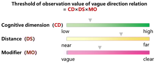 Setting thresholds for vague direction relation requires consideration from the three dimensions in Figure 5. The specific threshold value, which is affected by cognitive dimensions and modifier, can be determined by the question-and-answer method. The specific value, which is affected by distance, can be determined by experimental test or expert experience. The specific operation process can refer to the method of the threshold of vague distance relation.