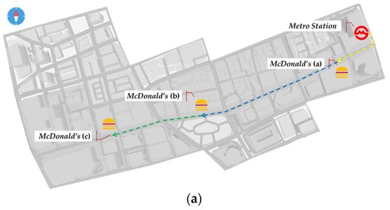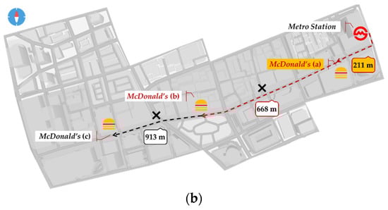 Based on the set of observations above, threshold settings may be low(c1) = 240 m, low(c2) = 750 m, and low(c3) = 800 m. These thresholds are set in a simple algorithm that can be trained in the literature []. The setting of these thresholds is affected by the movement mode, terrain environment, accessibility, weather condition and modifiers (Figure 4). For instance, in good weather, by car and another efficient means to travel to a place with flat terrain and road access, the location range of “near” is relatively broader. On the contrary, in bad weather, by walking and other inefficient means to travel to the place with rough terrain and road impassable, the location range of “near” is narrower.