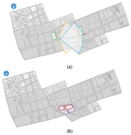 Positioning results of all compound spatial assertions. (a) shows all candidate location in Figure 11. (b) is the overlap of all candidate location. Besides, D is the location of Century Square determined by the candidate location, and G is the real location of Century Square.