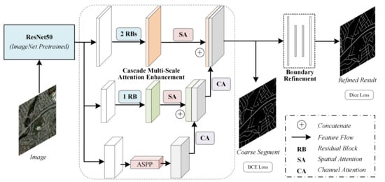 In this work, we propose a cascaded attention-aggregated refinement network to extract roads from remote sensing images. It aims to solve the problems of discontinuous road extraction and jagged boundary identification in existing methods. The main structure of the proposed method is illustrated in Figure 2.