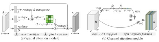For completeness, we briefly introduce the attention mechanisms used in our work, including the spatial attention module and channel attention module [,,], as shown in Figure 3.