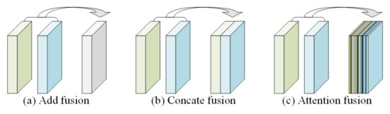 Comparison of different feature fusion methods. (a) Addition fusion. (b) Concatenation fusion. (c) Channel attention fusion.