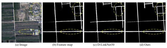 Almost all of the decoder strategies used in existing segmentation-based methods upsample the feature maps to the same scale as the input and classify the pixels of a road or background according to a specific threshold. As roads are always obscured by another object such as a tree or building shadows, especially at the edges of roads so that the context characteristics of the road boundary are unsmooth, making the boundary of the roads difficult to be recognized as smoothly as realistically. The yellow dash circle in Figure 6, from (a) to (d), represent the original imagery, visualizing a feature map of the last layer in DLinkNet50, the threshold-based segmentation on the feature map, and the labels, respectively. Obviously, the roads extracted based on the threshold are coarse at the boundary of occluded roads.