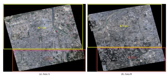 The road extraction dataset for the Huawei Cloud competition contains training and testing subsets. We only utilized the training set in our experiments because the labels for the testing set are private. There are two tiles of images from the Beijing2 satellite with a resolution of 0.8 m in the training set. The size of the images is 40,391 × 33,106 and 34,612 × 29,810 pixels, respectively. We divided the images into training and testing areas according to a 7:3 ratio, as illustrated in Figure 8. We clipped the test areas to patches of 1500 × 1500 pixels with an overlap of 18 pixels for testing, considering the limitations of a video memory size. Although it is widely acknowledged that a larger overlapping region and fusing results using voting strategy will significantly improve performance, we want to directly examine the performances without extensive engineering.