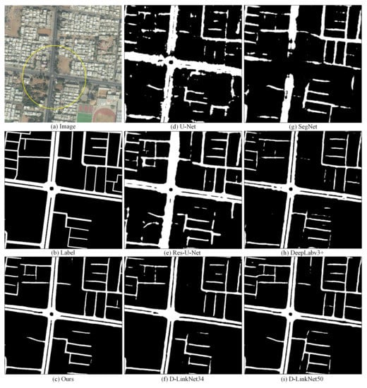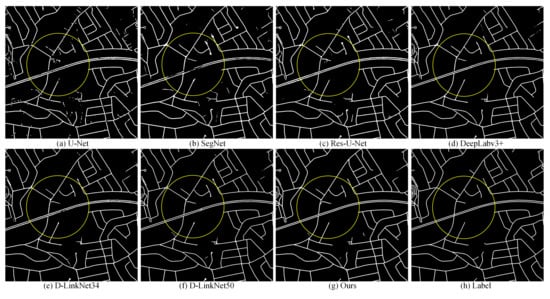 For the convenience of comparing the extracted results for related methods, we also present some samples and local details in Figure 13 and Figure 14, respectively. The results of the compared works and those of our method are shown in subparts (a) to (h) of Figure 13. In Figure 14, subparts (c) to (i) represent the local details of the proposed method and the results for U-Net, SegNet, Res-U-Net, DeepLabv3+, D-LinkNet34, and D-LinkNet50 corresponding to the yellow circle marked in (a).
