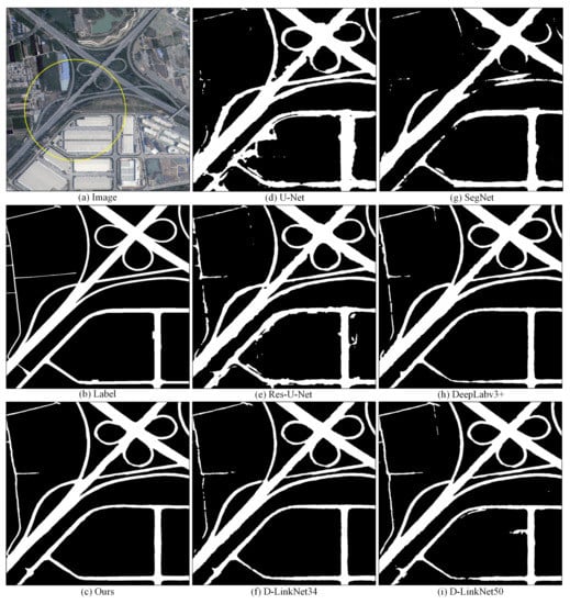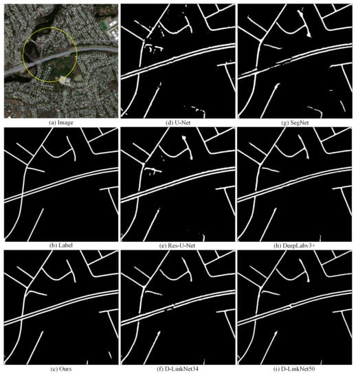 The results show that our method outperforms the comparison methods significantly both on the F1 Score and IoU metrics. In particular, our method achieved a 1.53% improvement over the IoU metric achieved by D-LinkNet50. For the convenience of comparing the extracted results of related methods, we illustrate the extracted sample and the exact local details in Figure 11 and Figure 12, respectively. In Figure 12, subparts (c) to (i) represent the local detail of the proposed method and the results for U-Net, SegNet, Res-U-Net, DeepLabv3+, D-LinkNet34, and D-LinkNet50 that correspond to the yellow circle marked in (a). According to the visualized results, the extracted results of the proposed method are more continuous than those of the comparison methods. Moreover, the road boundaries of our method are smoother than those of others.