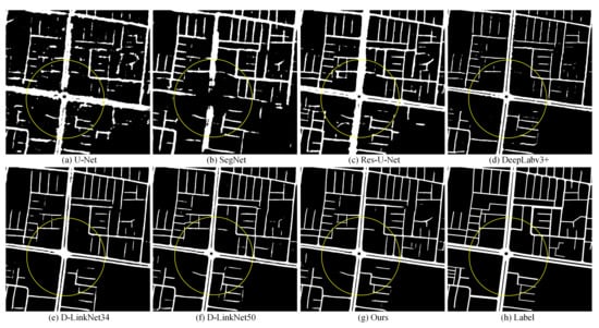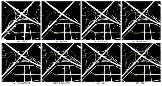 To verify the proposed method, we conducted comparative experiments on the Massachusetts dataset to compare the performance of our method with other classical semantic segmentation methods, including the U-Net [], SegNet [], Res-U-Net [], DeepLabv3+ [], and D-LinkNet [] series methods. Res-U-Net introduces the residual block based on the U-Net. D-LinkNet34 is based on ResNet34 pre-trained on ImageNet, and the backbone of DeepLabv3+ and D-LinkNet50 is ResNet50 pre-trained on ImageNet.