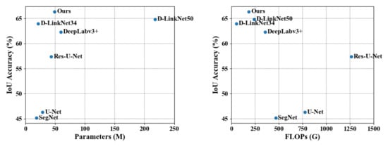 According to the results, our method achieved the highest accuracy of the comparison methods. In particular, the proposed method maintains much lower parameters and FLOPs than the ResNet50 pre-trained methods, such as DeepLabv3+ and D-LinkNet50. Although D-LinkNet34 significantly reduced the number of parameters and FLOPs, which benefited from a lighter pre-trained model than our method, the IoU accuracy also dropped. Overall, our method achieved a better trade-off between accuracy and efficiency than related methods. To intuitively compare the results, we visualize the relationship between the accuracy and trainable parameters and FLOPs in Figure 15.