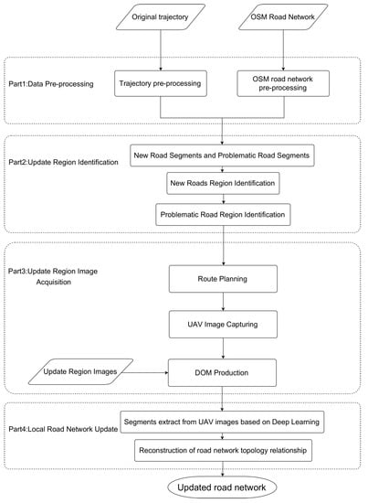 This paper proposes a novel incremental road network update method integrating GPS trajectory data and UAV remote sensing imagery. This method uses the characteristics of the HMM [5,6] map-matching method to identify new road segments and the connectivity of adjacent points in the matching process to identify problematic road segments. Deep learning technology is utilized to automatically extract the road segments from the digital orthophoto map (DOM) created by the UAV collecting picture data for the range area. Updating of new and problematic road segments is completed by reconstructing the road network topology. We make three main contributions compared to other methods, as follows: