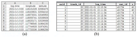 The raw trajectory data need to be processed as shown in Figure 2b, including the five attributes of the trajectory point ID (), trajectory ID (), the acquisition time of the trajectory point (), the moving object ID (), and the speed (v). The original vehicle tracks are tagged with license plates and collected chronologically. As shown in Figure 2a, the raw vehicle trajectories only contain trajectory point acquisition time , longitude , and latitude . The longitude and latitude can calculate the Euclidean distance between different trajectory points and the velocity of each trajectory point. To ensure the quality of each trajectory, the method divided trajectories into sub-trajectories when time or data are missed. Each trajectory’s ID () is assigned a value starting from 1. Each trajectory’s point ID () is named in ascending order starting from 1. The raw trajectory contains the license plate number and trajectory point acquisition times . The data processing process includes the following steps: