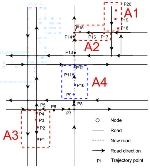 The trajectory points , , , and shown in region A4 in Figure 3 are clearly generated by the vehicle driving on the new road segment. The trajectory as the input data of Algorithm 1 can output the trajectory points .