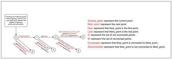 The core part of the algorithm is lines 5–38 in Algorithm 2, and its design idea is represented in Figure 5. The trajectory points in S are iterated through initially. The value represents the current point; represents the next point. When the transmission probability between and is greater than the set threshold , is connected to . The relationship between adjacent matching points in S can be divided into the following four cases: