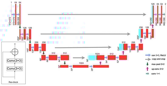 A combination of U-Net [48] and ResNet [49] was employed to identify the boundaries of road segments on the DOM, as shown in Figure 8. U-Net is an end-to-end deep learning model typically characterized by a U-shaped symmetric structure. The first half of the U-Net network acts as feature extraction, and the second half is upsampling, usually called the encoder–decoder [50]. The encoding part of the U-Net network consists of four convolutional layers, mainly used to extract high-level semantic information from the images. The decoding part contains four upsampling layers, and the high-level semantic feature map obtained from the encoding part is restored to the resolution of the original image by transposition convolution. U-Net uses skip connections in the same stage as the upsampling process instead of direct convolution and transposition convolution of high-level semantic features. Skip connections ensure that the final recovered feature map incorporates more low-level spatial information and integrates the spatial information of different scales, making the segmentation map recover more fine information, such as edges. U-Net is an excellent semantic segmentation model but is prone to gradient disappearance during the encoding process. The information lost in different layers of the encoding is preserved, and the convergence of gradient descent is accelerated by introducing ResNet in the coding process. Higher-level feature images can be obtained. The main structure of the model is shown in Figure 8.