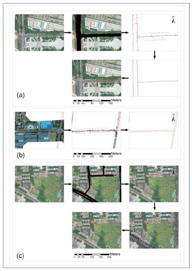 The proposed method could effectively update the problematic road segments. Figure 13a shows the actual situation of the problematic road segments in the study area. Figure 13b demonstrates the updated results of the problematic road segments by the method proposed in this paper. Figure 13c shows the updated results of Deng’s method. Figure 13d shows the updated results of Wu’s method. The methods of Deng and Wu cannot extract the problematic road segments effectively, while the method proposed in this paper successfully updates the most problematic road segments.