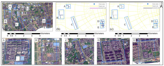 Updated results of the new road segments: (a) our method; (b) Deng et al.’s method (buffer size = 30 m); (c) Wu et al.’s method (cluster number = 200); and (A–E) partial enlarged drawings of updated results.