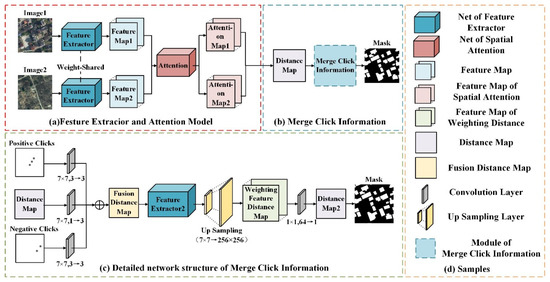 Figure 2c shows a detailed network structure integrating click information. In terms of the fusion mode, we refer to Conv1s Figure 3a in paper [22], which performs convolution operations on clicks and pictures to turn them into the same channel, fuses them, and finally performs feature extraction in a unified manner. In ICD, since the network is a dual stream structure, if clicks and pictures are merged at the beginning (Figure 3b), the impact of clicks will offset each other when calculating the difference between two pictures. Therefore, clicks cannot enter the network together with the pictures at the beginning. Since the point to be corrected by the clicks is the change area between the two pictures, we will start with the distance map (purple module in Figure 3c) indicating the change and integrate the clicks with this part. First, a 7 × 7 convolution operation is performed on the characteristic distance map and 1 channel is converted to 3 channels to fit the channel number of clicks. Next, a 7 × 7 convolution operation is performed on the positive and negative click maps to unify the two dimensions with the feature distance map. Then, by adding the weights of the feature distance map and the positive and negative clicks, a fusion distance map X is obtained, which integrates the click information. Then, X is sent into a new feature extraction network for a new round of feature extraction, and the result of feature extraction is sampled up to make it from 7 × 7 to 256 × 256 and the new feature distance map X’ is obtained. Finally, a 1 × 1 convolution operation on X’ is performed to convert 64 channels to 1 channel and perform a threshold filter, and then the final mask result can be obtained.