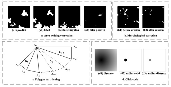 After selecting the clicks, the positive and negative clicks of each sample are generated according to a certain radius. Since the accuracy of the ordinary Euclidean distance graph (Figure 4d1) is not as accurate as the solid point with a certain radius (Figure 4d2) [22], we improved it (Equation (10)) so that the color of each click center is the deepest, decreases outward along the radius, and returns to the background color at the radius (Figure 4d3). This method can reduce the influence weight of the click edge and make the correction range more accurate. The experiment is described in Section 3.2.