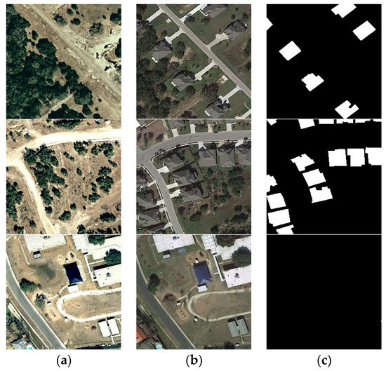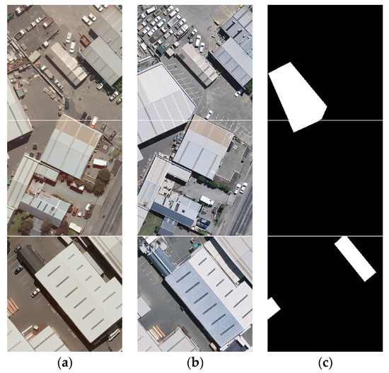 Two-phase images and change information of the WHU building dataset. (a) image1; (b) image2; (c) label.