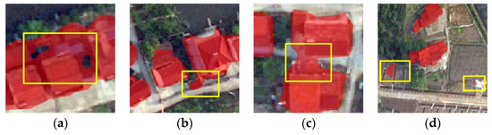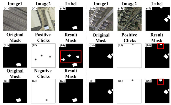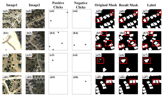 In summary, Gradient_Res, which uses gradient points and secondary feature extraction, is the optimal network structure, and users can effectively modify the area by adding positive and negative clicks. The test results of the LEVIR-CD dataset under the ICD network are shown in Figure 10, in which all changed areas are marked with a red box, and the original mask, result mask and label represent the original forecast result, click correction result and actual change label, respectively. Figure 10a6–c6) show the effect of using positive clicks to make the houses not fully predicted obtain the full prediction, which shows that a positive click can effectively fill in the prediction vacancy; Figure 10b6,d6 show the effect of partial negative-click segmentation on the glued houses. It can be seen that the negative clicks in the figure can segment the gaps between the houses without affecting the shape of the houses.