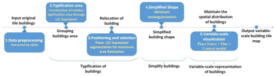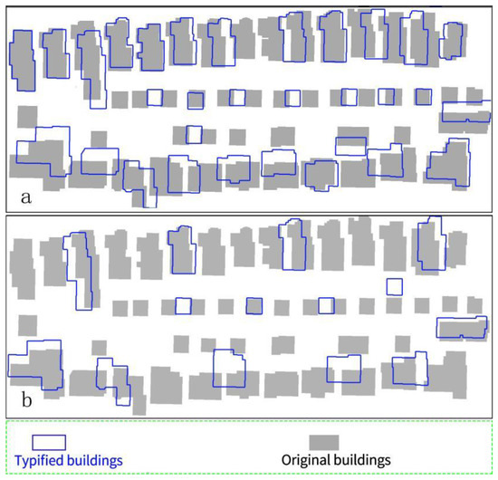 - Gong, X.; Wu, F. A typification method for linear pattern in urban building generalization. Geocarto Int. 2018, 33, 189–207. [Google Scholar] [CrossRef]