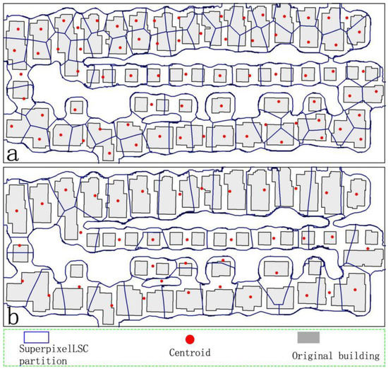 - A method based on LSC superpixel segmentation is proposed to typify, reduce redundant map elements, reduce the number of buildings [17], and compensate for the problem of quantitative relationships between hierarchical organizations of multiscale spatial indices in traditional methods to comprehensively consider the overall map synthesis;