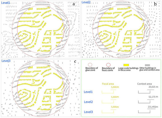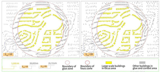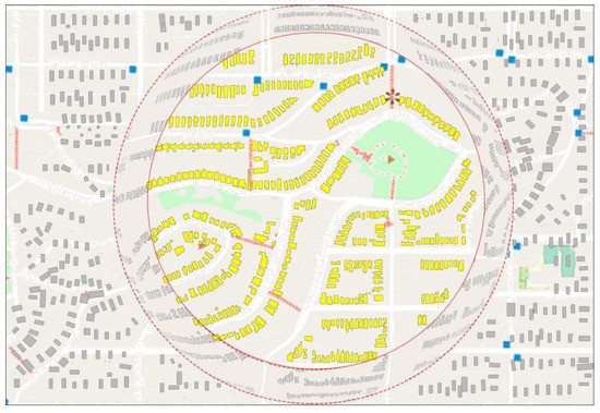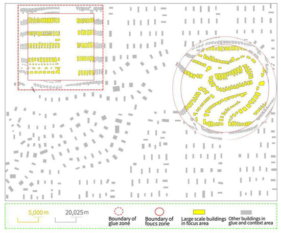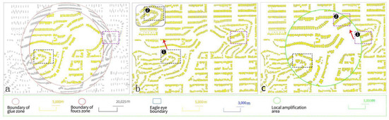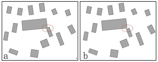 - Considering the number of buildings, the layout and shape of buildings, and the size of buildings, the variable-scale visualization method is used for high-density building areas to improve the user’s recognition of this area and the readability of information.