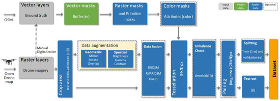 The following pipeline produces datasets to train deep learning models robust to geometric, spectral, and multi-scale variations of geographic objects. The produced datasets consist of image–mask pairs (img, msk), coupled at the pixel level, i.e., drone image chip, binary mask. The datasets are produced separately for point, line, or polygon object geometry. Figure 1 illustrates the steps of the proposed pipeline. Raster layers and vector ground truth data are the input to two separate process lines in which some of the steps are optional depending on the needs of resultant dataset. Next, we describe the different steps of the pipeline.