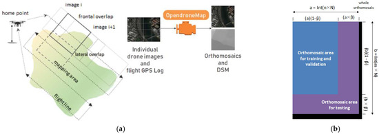 (a) Drone imagery workflow, (b) cropping area for training/validation and test datasets: “a” and “b” are the number of pixels horizontally and vertically, respectively, “n” is the number of images in every axis, and “” is the tessellation size, for instance, 256 × 256 pixels. The black area is the residue of tessellation.