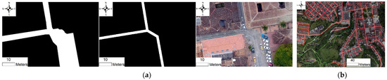 Ground truth data are obtained by querying OSM vector layers using a Python script and “overpass” open-source library (https://pypi.org/project/overpass/ (accessed on 2 March 2022)). Depending on the part of the world, roads, pois, rivers, and, less frequently, buildings can be downloaded in a matter of seconds. Appendix A links a repository for the Python scripts and data used in this paper. Specific data of interest that cannot be found in OSM, for example, vehicles, people, and animals, should be digitalized in the screen from the start. This is done by manual tracing point, line, and polygon to represent objects using drone orthomosaics as base geo-referenced layers. Point objects are those than can be depicted as coordinates at a geographical extent. Line objects are those in which length is a lot larger than width. They are digitalized by adding vertices at any change of direction and have at least two vertices. Polygon objects are regions, and vertices are created at every change of direction until the last vertex coincides with the initial one.