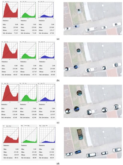 As can be observed in Figure 7, compared to the road masks, the vehicle masks do not exhibit a perfectly Gaussian-shaped curve, probably because vehicles are not uniformly colored. Although full-size masks consist of more pixels, the RBG distribution looks very similar to the distribution of other distance masks; moreover, full-size masks have a slightly higher standard deviation (brown vertical line) than the 1 m buffer mask (orange vertical line). The graph of the standard deviation vs. distance shows that a buffer distance of 100 cm seems to be the most appropriate buffer distance for producing primitive masks in roads.