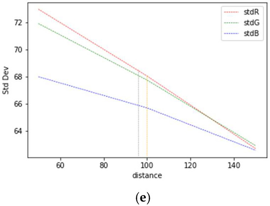Primitive mask for vehicle dataset. (a) 50 cm pixel distribution and mask, (b) 100 cm pixel distribution and mask, (c) 150 cm pixel distribution and mask, (d) full-size pixel distribution and mask, (e) graph of standard deviation of RGB pixel values vs. buffer distance.