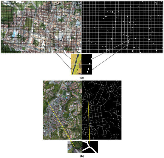 Imbalance has been tackled directly in model architectures, especially for road datasets and, very unfrequently, for point datasets. In our approach, imbalance is studied in the dataset preprocessing point and linear objects. Examples of the first rationale include the Road Vectorization Network (RoadVecNet) presented in [12], which comprises two interlinked U-Net networks to simultaneously perform road segmentation and road vectorization. The authors utilize a loss function called focal loss weighted by median frequency balancing (MFB_FL) to focus on the hard samples, to fix the training data imbalance problem. The researchers in [13] worked out a method of extracting roads and bridges from high-resolution remote sensing images in which edge detection is performed, and the resultant binary edge is vectorized. Their network integrates binary cross entropy to deal with road class imbalance. Ref. [4] presented a weighted balance-loss function over a PSPNet to solve the road class imbalance problem caused by the sparseness of roads. Many scientists concentrate their efforts on modifying the models to improve the resultant masks and not on enriching the input datasets, as in our case. For instance, [14] uses a pre-trained VGG network into a U-Net and attention module to solve road problems such as tortuous shape, connectivity, occlusion, and different scales scenarios.